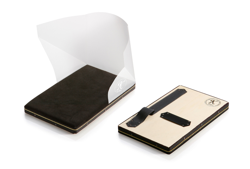 Bladgoudkussen met windkap en lederen bandjes aan de onderzijde.