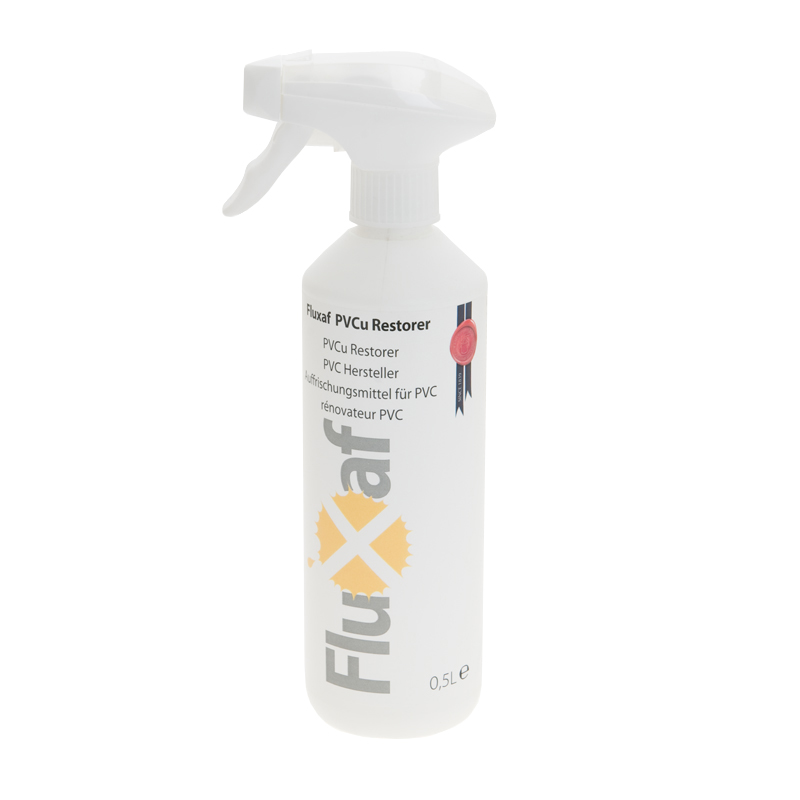 Fluxaf PVCu Restorer is een krachtige milieuvriendelijke, watergedragen hersteller voor het verwijderen van diepliggend vuil, (af)watervlekken en verkleuringen van witgekleurde PVC-ramen, -deurkozijnen en -panelen. Vitaliseert het verweerde PVC en herstelt de witte kleur.