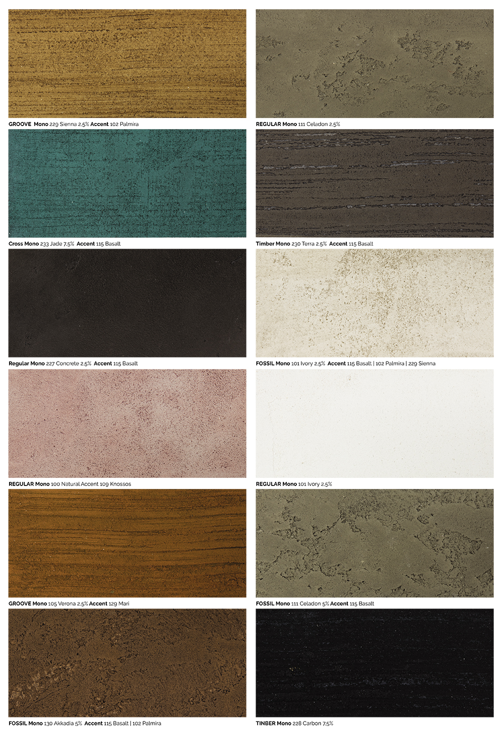 Crustal wordt in de eerste plaats in de massa gepigmenteerd. Crustal Mono kan zo zowel een egale krijtmatte pleister creëren als een ruwe, natuurlijke look. Voor meer diepte in de kleuring en een nog mooier 3-d effect, kunnen met Crustal Accent dan weer meer of minder subtiele kleurnuances gecreëerd worden.